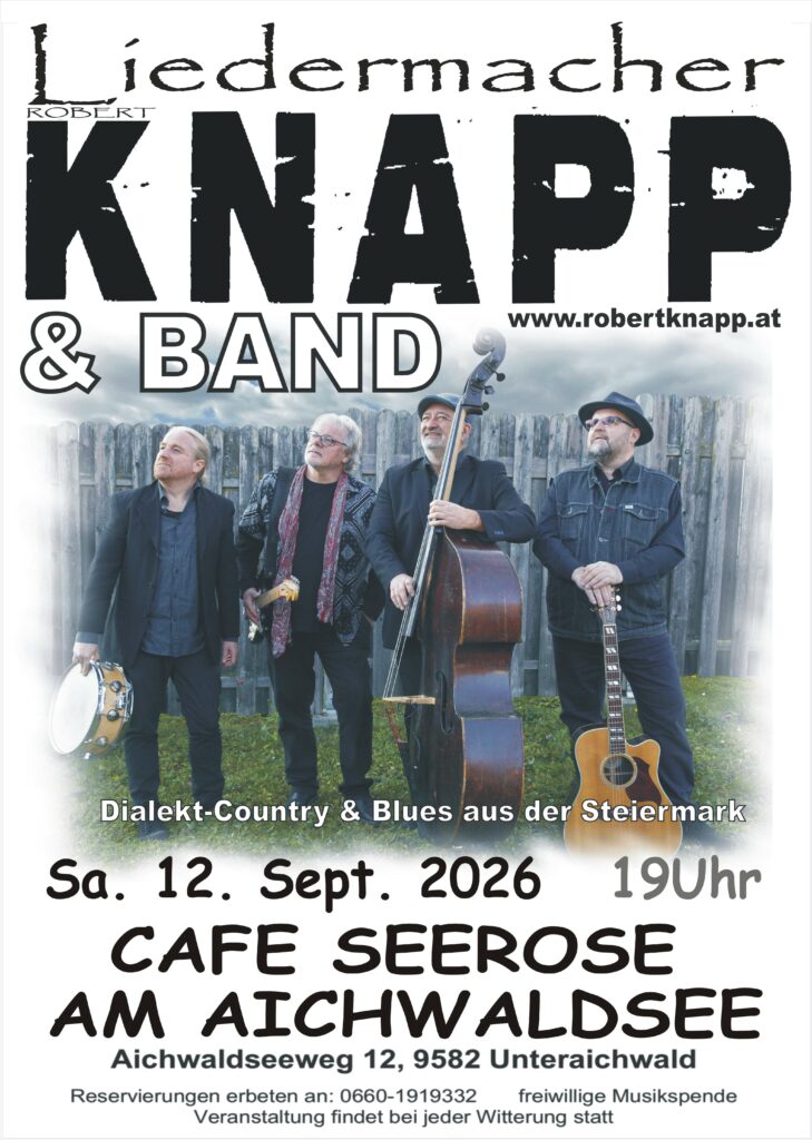 « Alle Veranstaltungen ROBERT KNAPP & BAND Cafe Seerose Aichwaldsee KÄRNTEN 12.September von 19:00 bis 22:00 freiwillige Musikspende « DINNER MIT MUSIK BY ROBERT KNAPP & ZWASAM MIT BAND ROBERT KNAPP & BAND IM GAUDIUM » Zum Kalender hinzufügen Google Kalender iCalendar Outlook 365 Outlook Live Details Datum: 12.September Zeit: 19:00 bis 22:00 Eintritt: freiwillige Musikspende Website: https://aichwaldsee-cafeseerose.at/ Veranstalter Cafe Seerose Aichwaldsee Telefon +43 660 19 19 332 Veranstalter-Website anzeigen Veranstaltungsort CAFE SEEROSE AICHWALDSEE Aichwaldseeweg 12 9582 Unteraichwald, Kärnten 9582 Austria Google Karte anzeigen Telefon +43 660 191 93 32 Veranstaltungsort-Website anzeigen Robert Knapp & Band freut sich auf ihren Besuch
